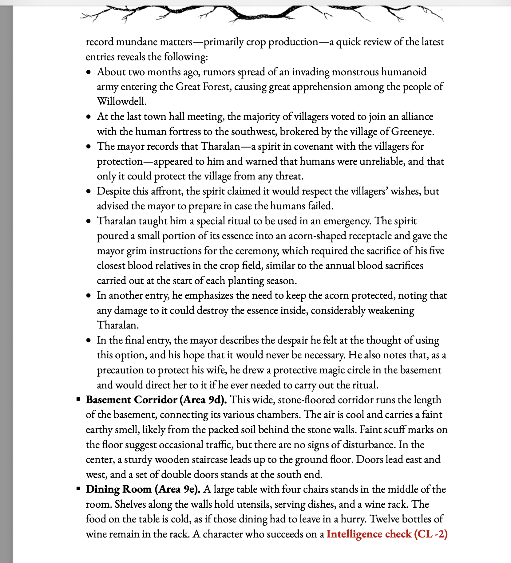 But the major problem here, beyond the simplicity of the thing, just hacking, is that it is wordy and padded out to a pretty extreme degree. 22 pages to describe twelve locations gives us an average of two pages per location. And some are much longer, with the majors house being five pages long. And that’s not a bunch of room s being described. How do we get here? “CK Notes. This is the village mayor’s residence.” Yup, that’s what “Mayors house” usually implies. We get a bunch of backstory in it. And we get a SHIT TON of backstory and exposition. Everything is padded out. Every “room”, every creature, everything that you could come across. And every entry n the adventure is like this. Single column everywhere. The presence of bullets doesn’t really help, with information being spread out over so many pages. The effort to make it more approachable has resulted in it being infinitely more confusing. For a relatively simple hack adventure. And it comes off as rather generic. While there’s backstory and explanations on the hows and whys there is little in the way of speciality to ground the adventure.
