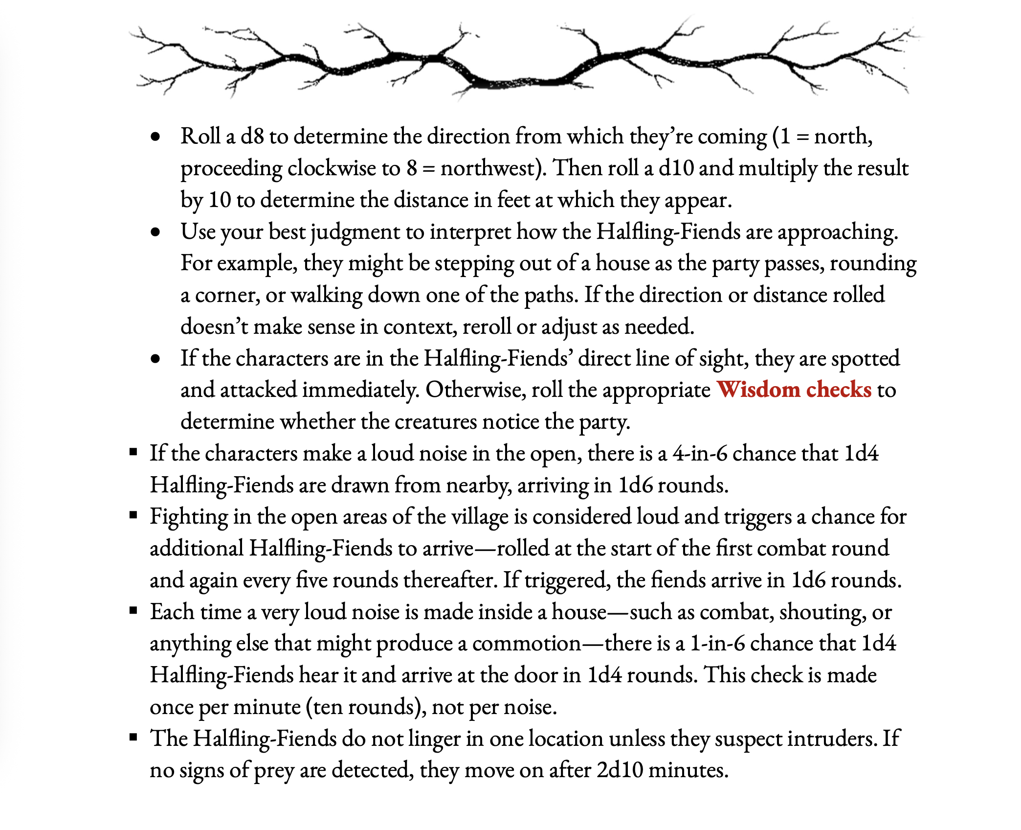 Two pages of backstory. A lot of appendices, as the page count would suggest. The wanderers take a page to describe even though it’s just “you might run on to a roving band of halflings while going from one location to the next. (Which is a 33% chance every five minutes …) This is an insane amount of text for something so simple. And the only color here is a suggestion that the DM might make them come from a nearby house or something, in almost those exact words. There is no specificity. There’s epilogue, which I’m usually glad to see, except in this case there’s nothing much going on. You won! Yeah! The mayors wife is the new mayor. And if you lose? Nothing much happens, in terms of specific outcomes. “Epilogue – The conclusion of this adventure will depend on the characters’ actions and decisions. While there are multiple possible outcomes, these are the primary scenarios, which you can adapt to t your campaign:” Yup, that’s what an epilogue is and how you got there. I’m surprised, a bit, that each word used is not defined.