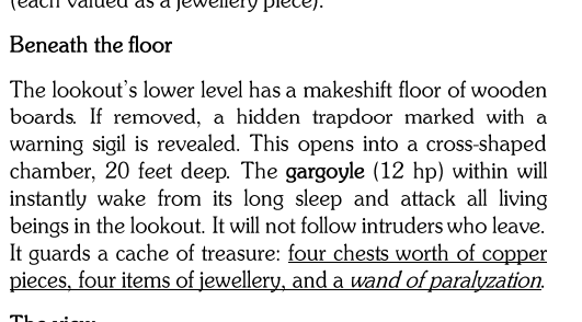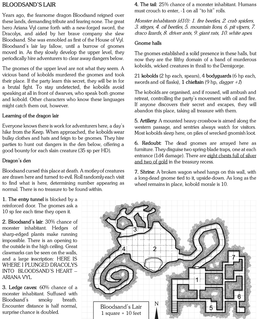 The content, proper, can feel abstracted. Not as if an encounter is being listed, but rather as if someone were describing an encounter, much in the same way that I do in a review. A ghostly warrior who is you defeat will point to a gravesite containing the same sword and armor we wore and also a chest of gold. How much gold? Deets on the armor and sword? Nope. That’s it. It’s more of a seed, an idea of an encounter rather than encounter. And much of this feels that way. It’s tax day in town! That’s really all you’re getting. I get that some of these are meant to be ideas, but they seem longer than a seed, an idea but lacking the specificity that one might expect to be able to really launch them in to something, something to riff on. “Artillery – A mounted heavy crossbow is aimed along the western passage and sentries always keep watch for visitors. Most kobolds sleep here, on piles of wrecked gnomish loot.” It’s an idea. There ARE kobolds here, sentries at the least, yes? I don’t understand why its written this way. It’s like there’s an allergy to the specifics. And, yet, sometimes you’ll get paid 2sp by someone to do something. It’s maddening, the seemingly random way in which sometimes minor and meaningless trivia is included and yet the meat of what should be in the adventure is not.