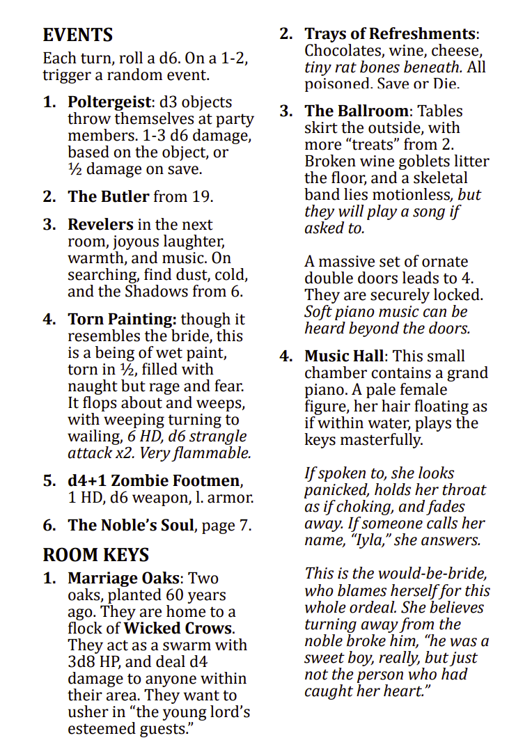 I love some of what’s going on here, even if I may be dissatisfied with the results. First off we see the rooms have a room name. Music Hall. Ballroom. You know what those rooms are, because you, gentle reader, know what the fuck a music room and ballroom look like. This orients the DM. Now, when I read the rest of the description I am reading it in the context of “Ballroom.” This will make it easier to riff on things and get the imagination going. The same general formatting is present. A short little description followed by some extra DM information in italics. The italics never goes overboard and is probably right at the edge of what I would find acceptable for highlighting before it becomes harder to read. Still, another technique would have probably been better.