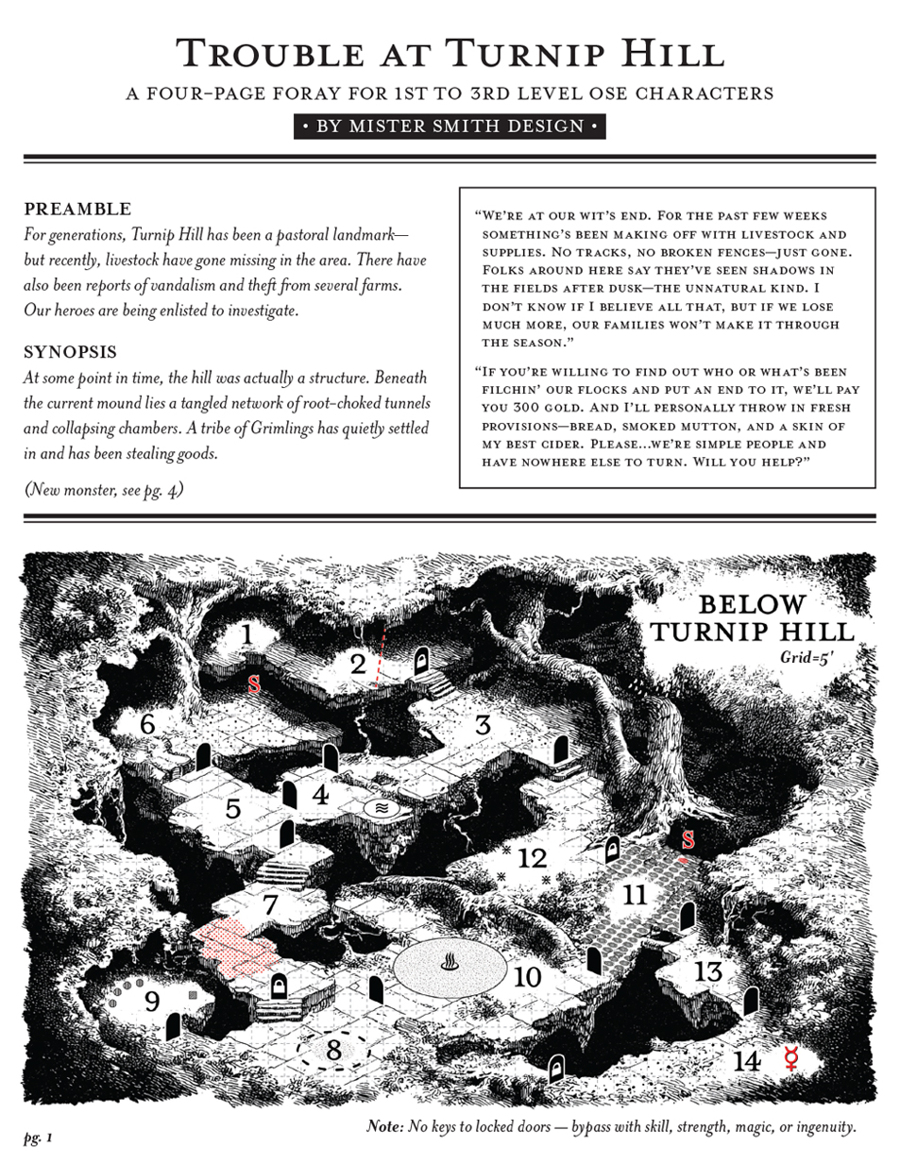 This thing is certainly moving in the right direction, much more than most of the endless line of adventures coming out. It’s tight, the writing tries to be evocative, the map is nicely evocative and things are least themed to a non-generic degree with the burrow/tree root/dugout thing going on. Slave to the format, be it the encounter format or the page count, means having to focus more on form over function, to the detriment of the adventure. Also, loot feels lite for B/X.