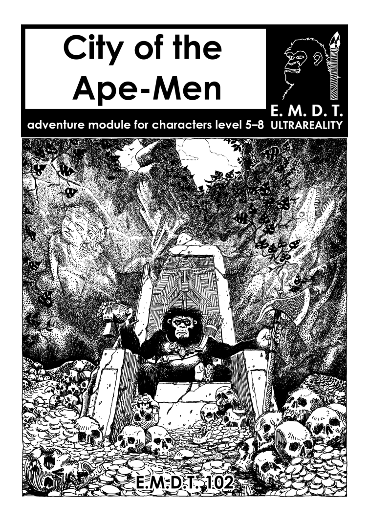This sixty page adventure is an Isle of Dread, but with ape-men in the lost city. A complex environment with large groups to challenge the parties looting efforts, it does a hex crawl with some locations being mini-dungeons. Bring those cargo ships to haul away the loot and avoid the pirates while dodging the secret masters manipulation of the apes. The logistics game is the only thing missing.