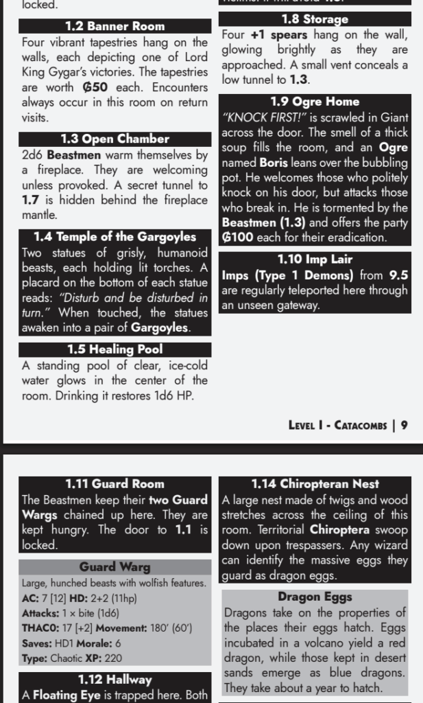 Monster summary in the back, along with wanderer tables, which is a good idea. No monster descriptions, which is a bad idea. The map does denote which rooms have internal light sources, which I enjoy to help me run a level. But, also, the rooms try to denote it also by placing the text in either white or black font, which I think makes it busy. Not to the point it’s illegible or anything, I just don’t think it does what the designer wanted, it’s already on the map, and, worst of all, it annoys me. 🙂