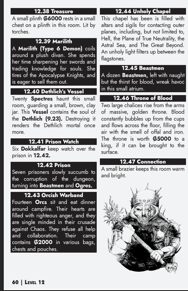 And, more than that, they come off disconnected. Why are the spears there? I don’t mean backstory. There’s an ogre nearby. And imps. Gargoyles. Beastmen. The Hunger. That’s a lot of monsters. A zoo almost. In the rooms surrounding Ye Olde Glowing Speare Roome. I don’t need a historically accurate number of farmers to yeomen in a village but I do need the vibe to seem plausible. Why are they still there? And, for that matter, why the fuck are all of those monsters living so close to each other? This is why we have lairs, and zones of control, and themes areas in dungeons. It keeps this kind of monster zoo thing from happening. There are dead zones. And dead zones between areas can have secrets. Like four glowing spears hanging from the walls. So, it all just kind of comes off as disconnected. Sure, it’s a room and the description does not overstay its welcome. But, also, the description isn’t really bringing the room to life in any way AND the overall design and placement of the room doesn’t really contribute to a bigger picture. On the first level the leader of the beastmen, a single orc, sits on this throne, his 3000gp(!!) treasure in the next room. He’s flanked by his beastmen guards. So, I guess two of them? Pretty nice fucking loot. And no beastmen lairs or orc lairs or really ANY other monsters nearby. Just dude on his skull throne with his two bros. There’s no real level vibe. Or zone vibe. Or room vibe. Just do you thing in THIS room and move on. It’s not even full of special rooms, like, a set piece after a set piece like the Tower of Gygax con game specials. I don’t know, a more boring Stonehell barbican?