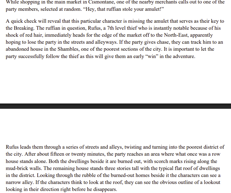 Travel from the city of Cismontane into one of the worlds beyond the Breaking on a mission to stop a monstrous cult. While shopping in the main market in Cismontane, one of the nearby merchants calls out to one of the party members, selected at random. “Hey, that ruffian stole your amulet!”