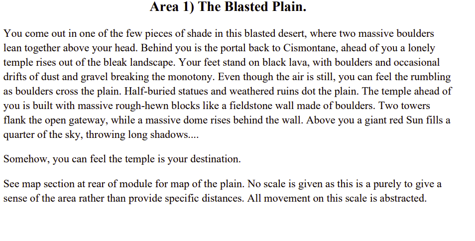 Some of this is formatting. We see here a single-column approach which makes that information transfer clumsy. And being concise in the writing while still being evocative. And here the writing is somewhat cumbersome and the general vibes meant are not really conveyed very well in the use of the descriptive language. Lost in the translation of The Telephone Game, so to speak. And then there’s the linear gameplay, where scene A leads to B leads to C leads to D. This is something that I think a home game does often, with the DM providing the glue to tie the various beats together, riffing in between them and perhaps dropping clues, etc to get the party to the next beat. Chase a thief, wander into cultists, go through the Breaking/Stargate, hit the temple exterior, then the two scenes in the interior, to get their stolen item back. And in a published adventure there needs to be just a bit more glue. Not a railroad, but support for the DM to get from A to B to C without it looking linear, just as one might do in a home game.