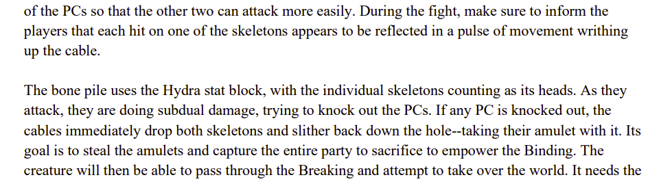 There’s another portion, inside the temple, with a great piles of bodies, mostly skeletonized, and black cable-like things extending from the ceiling in to them. The skeletons get ‘animated’ by the cables, in a kind of puppet way instead of being undead. As you hit the skeletons pulses of energy ripple up the cables, with the entire encounter being treated much the same way as one would a hydra. You can kind of get a good image of what the designer meant, even if it, again, isn’t exactly the most evocative or clear way of describing it is present. The mechanical animation and treating it like a hydra are great riffs as well, again, a kind of imagination forward version of design with some rules thrown in to make it work instead of the other direction.