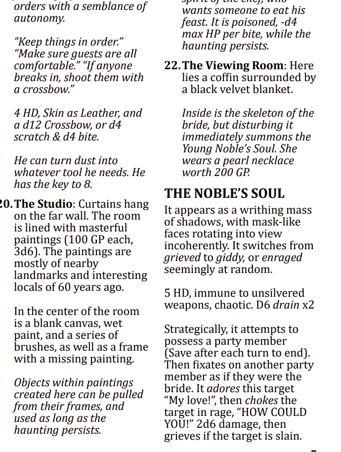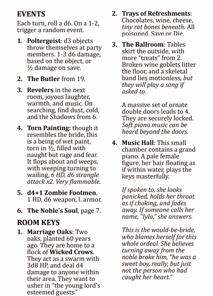 I love some of what’s going on here, even if I may be dissatisfied with the results. First off we see the rooms have a room name. Music Hall. Ballroom. You know what those rooms are, because you, gentle reader, know what the fuck a music room and ballroom look like. This orients the DM. Now, when I read the rest of the description I am reading it in the context of “Ballroom.” This will make it easier to riff on things and get the imagination going. The same general formatting is present. A short little description followed by some extra DM information in italics. The italics never goes overboard and is probably right at the edge of what I would find acceptable for highlighting before it becomes harder to read. Still, another technique would have probably been better.