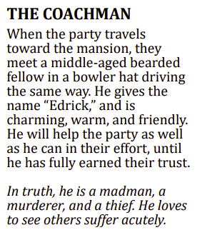 We might call this almost the platonic encounter in this adventure, an example of what all other encounters are like. Big title. Coachman. A little encounter, and a terse description. Charming, warm, friendly, helpful. And then a sentence at the end in italics which brings into context the more general description above. What’s really going on, so to speak. We can see further example of this in the main adventure site keys.