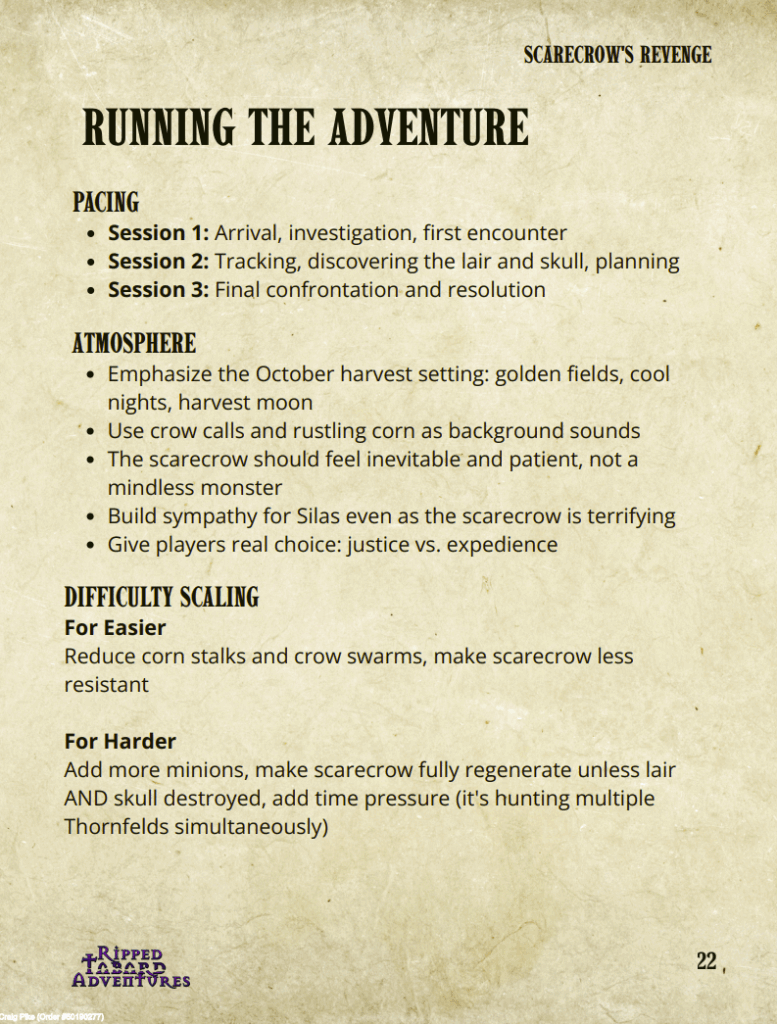 There are hints in that screenshot of some decent things. The harvest setting portion in particular, although, again, this is mostly generalizations. It’s more advice than the grounded things that a DM could riff on to make an adventure really comes to life and hit home. This is not, by any means, a throw away adventure, though it tackles the trope of a vengeful autumn scarecrow. Anyone who has heard the wind wistling through dry corn can imagine the eerie vibes it brings, but if you’ve not then you’re going to struggle to bring that to life.