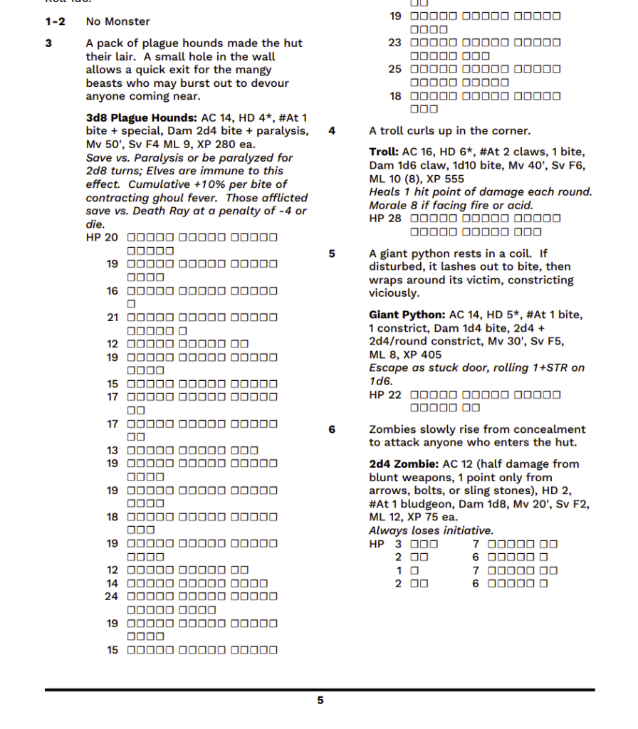 Basic Fantasy has a house style. You can see, I think , the issues with the HP tracker and stat block design. They seem committed to it. Would, I think, their commitment extended to “a trolls curls up in a corner.” Basic fantasy: producer of six word encounters with nine inch long stat blocks. Hmmm, probably not the best of marketing blurbs.