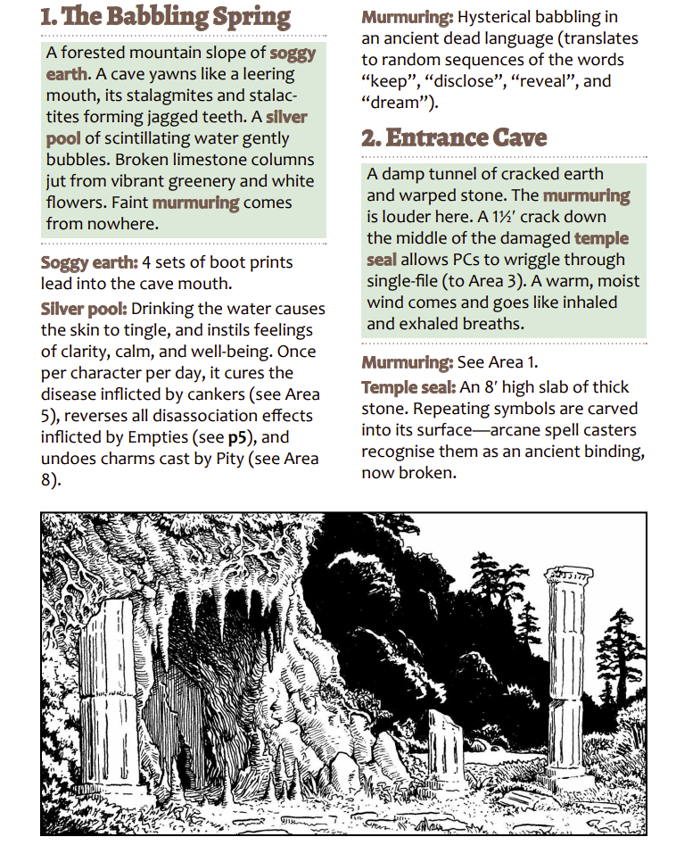 I don’t mind the old keyword style, but I do know it gets under the skin of the traditionists. I do like a more sentence like structure, but, that’s just personal preference. Whatever works and the old OSE style works as does this one. Nice little offset in a color box, some bolding. Not the biggest fan of “see area one”, but whatever. Soggy Earth. Silver Pool. Murmuring. Nice descriptive words. It doesn’t always follow through like that. “Ornate stone table” “honeycombed shelves” and the like. But it’s clearly trying in both instances.