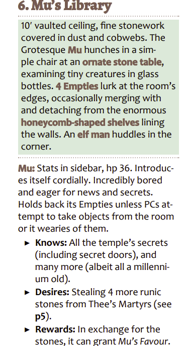 Already we can see a few interesting things, just from the setup. The call back to the actual Delphi is a nice one, this kind of an appeal to a cultural memory that then overloads all of whats to come in the adventure. I sometimes refer to room titles in an adventure, instead of putting in “Room 1” you instead say “1. Pristine Kitchen” This lets the mind get a kind of framing of the description to come. Everything is seen through the lens of Pristine Kitchen. And the appeal to the heritage is much the same. Ophelia comes with context. History. All the media that’s every existed that has leveraged it that the DM and the players have consumed, consciously and subconsciously. And so all of that is leveraged when an adventure makes direct or oblique references to it. It’s all about bringing more than the actual words written to the page. Big vs Cyclopean. And then also the Royal Witch Hunters. Specificity. There’s not much more information so the mind naturally races to fill in the gaps, wondering. Not “adventurers.” Or the better “Mercenaries.” Or the better “Murder hobos.” But the better still “Royal Witch Hunters.” One still lives, inside the cave/temple. “Mu freely volunteers that this is the witch hunter Crawe, who was set upon by Empties when Mu tired of him. Mu is able to reverse the process but sees no reason to.” Nicely done. Except, also, I don’t give a shit about the witch hunter, Crawe or not. No reputation for good or ill, no connection. The royal witch hunters don’t really get enough for anyone to really care about their fate. I guess the various prisoners in the OG adventures don’t really either. “Elf. Will join party for one year.” But, also, it’s clearly meant to be a kind of motivation since they Do get the title “royal witch hunter” instead of “elf.” Ahhh, I’m not really bitching here, I’m just pointing out the disconnect.