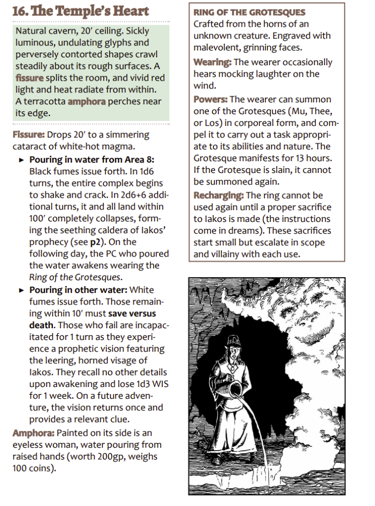 And, thus, interactivity. We’ve got some “steal the loot without busting the tree pustule” stuff. (Which, I note, doesn’t really come out in that summary description, explicitly or implicitly.) We’ve got the three Grotesques, who want to talk until they get bored with you. (Always good advice in every situation: don’t be boring.) Maybe they want you to go steal something. Pity, who wants to eat two people. A prisoner. And the whole “fulfill the prophecy” thing. There’s some stabbing and talking. I don’t know. It feels a little lacking. Then again, I might just be bitching about the small size. Four or five different things going on in sixteen rooms is a little cramped, yes? Anyway, not many mysteries to discover here. But, also, a nice little “push” on what to do if the party fucks up the prophecy, as well as some decent consequences for fulfilling them that doesn’t fuck shit up too much but still provides something meaningful. And, nice magic item. This is the kind of non-generic shit that really gets me going. escalate in villainy. Make those asshats Grotesques do some shit for you. 100′ caldera. Nice job!