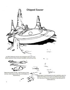 This five page adventure uses about two pages to present about thirteen rooms in a crashed flying saucer. Basic descriptions, simple map, not much beyond the most basic of encounter structures. And, of course, too small for its theme. But, hey, it’s got more rooms than pages, so there’s that!
