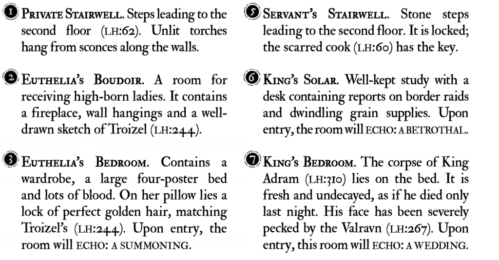 Which brings us to how this is described. Caste Lethe is one of the sites in the adventure, the home of the lord. What we can see from this a framework. Not a traditional room/key, although its laid out like that. And, yet, it almost certainly iS a traditional room/key exploration. No one is home. The party will be exploring this unknown environment just like any other dungeon they have invaded. But the descriptions are pretty utilitarian. Like I might expect if this castle were hosting a murder mystery or the ship the party is travelling on. The specificity is lacking in these. There is little here. Two entries, the Scarred Cook and Mouldering Bodies, get a little paragraph follow up, and you get some “Echoes”, ghostly vignettes, to toss in. (A diary, in essence, showing you what has happened and perhaps helping you understand that stomach lovers last meal, or, at least, might in some circumstances let you eventually jump to that conclusion.) But beyond that there is little here to base an adventuring locale on. And I’m not talking about the standard loot, monster, traps, and specials framing. We can acknowledge that an empty ghostly castle, forlorn, with ghostly vignettes and a catatonic cook can be a thing. But there’s nothing to sell that vibe. We have almost, if not totally, generic descriptions. There is almost nothing n the way of help to the DM to sell that forlorn vibe. This is hard, as a designer, to communicate your vision to a page in such a way that the a DM can pick it up and run it the way you envision. And, yet, that IS the goal of the designer. And this just doesn’t do that. It comes off as generic. Abstracted. And the adventure in play will suffer for it. You must inspire the DM with the environment. And that is not happening here. Evocative writing and specificity sells the adventuring locale. And this is the manner in which it feels like the majority of the locations are described in this. It is not the one-pager that has failed but the context in which the one pager is presented, along with the actual descriptions of the environments.