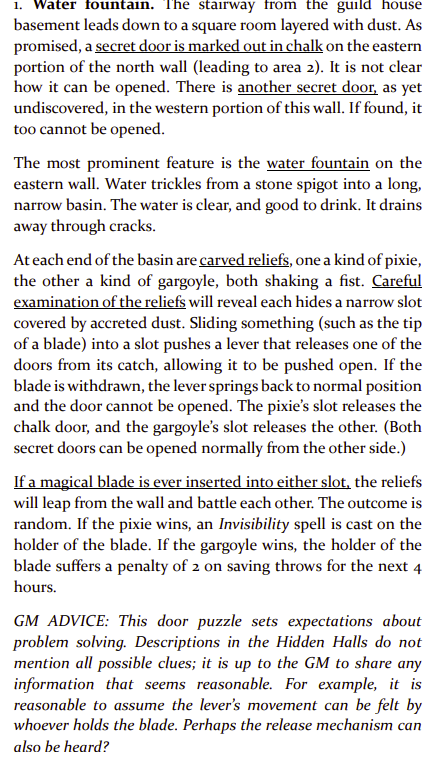 What you’re looking at is nearly a column of text describing room one in the dungeon. This is the basement room of the guildhall and the entrance to the hidden halls. And it’s got trap and door porn in it. This is nearly a column of text to handle two secret doors in a room with a basin. Which are also bland in description if not in effect. Shaking their fists, magical blade, that’s great. I’m not sure, though, that this is the sort of entrance to the mythic underworld I was looking for.