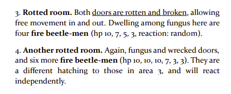 Never fear though, we follow that up with rooms three and four. Rotted. Fungus. Beetle-men. No, I don’t know what they look like. “Stats as fire beetles.” So, yeah. I’d like to point out at this point that B2 was not the end all be all of design. It’s been fifty years. I think we can do a little better. There is a huge place in D&D for “monster wants to eat you, better stab it.” And there’s no place in D&D for an overwrought encounter. But there is a place in the middle where everything works together, the encounter, hack or no, has enough in it for the DM to riff on, both in creature and environment. “Fungus and wrecked doors” does not a description make. Nor does “fire-beetle men”, presumably just standing there waiting to die and have their glands ripped out? Hmmm, come to think of it, I love the idea of giant throbbing diamond-forehead men. Enough diamonds growing out of their foreheads to level. Sitting in a circle playing games and singing songs. “How the fuck did these dudes live even this long?!” As your DM I make no judgment upon you, PC’s, but simply delight in glee at the reaction to the situation.