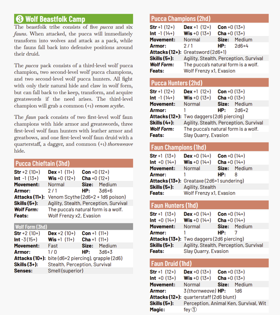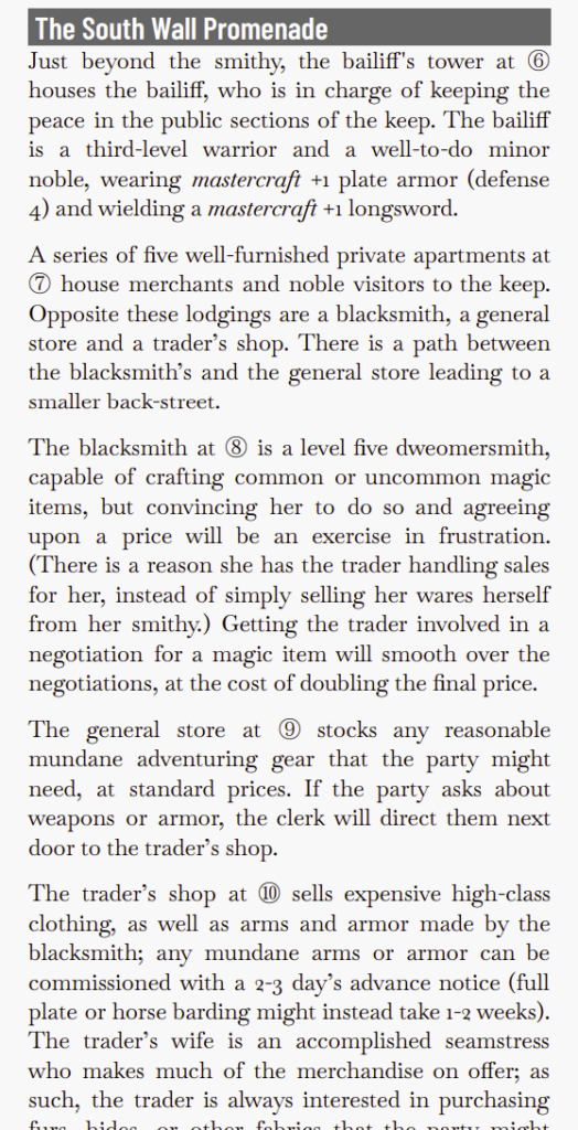 But, of course, the read-aloud is far too long. More than three or four sentences and the players attention goes elsewhere. The font is not the best for the DM to focus on. It turns purple in several place “eyes cold and black with predatory hunger” and “a blur of muscle and razor-sharp teeth.” In other places the read-aloud over-reveals (even here, with regard to the shark) and thus destroys that interactivity loop between the party and the DM that is at the heart of every RPG. You want the cue the party and then have them follow up. And I always wonder, when seeing this misplaced effort, and then supported pages in the preamble and appendices, what might have been if the effort spent on that were instead spent on the keys, or by enhancing the village/hook/shipwrecking just a tad.