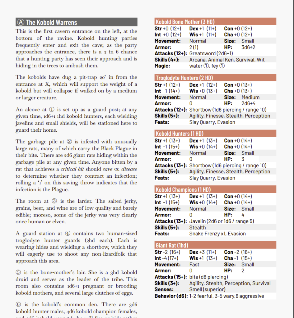 The overall effect here is the highly proscribed nature that one thinks of in 4e adventure. The read-aloud is a preamble to what’s import: the mechanistic action of the party members. The focus on mechanics and the environment to “spice up” the combats. “Ahh, yes, but in THIS fight with the kobolds there are areas of quicksand on the floor and gusts of wind to extinguish torches! And a big red button the wall behind the kobolds that turns everything off.” It this tendency toward the encounter as set-piece, constructed, rather a more naturalistic bend in which play naturally evolves. It’s not quite in this territory, but it is leaning in that direction with the perfunctory read aloud. And, I think, without it, a more naturalistic manner of play.