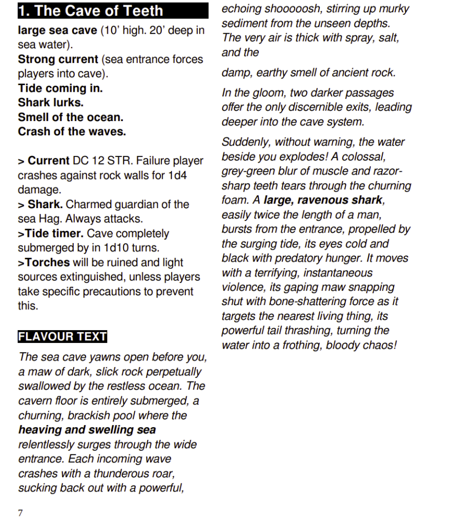 On the positive side of things, the read-aloud it at the end and relatively easily avoided. It’s not at the beginning, getting in the way. I think this is meaningful, cognitively. It’s not vying for your attention before you get to the room, proper. And then, of course, the summary information is using a keyword style. Tide coming in. Sharks lurking. Smell of the ocean. Crash of the waves. That’s not bad. More evocative than not and lodges firmly the environment in the DM. We know the vibe. And then, of course, a few little mechanics things to help guide the DM. The torches, the tide timer (timers having been covered in the preamble to the keys), the creature. Frankly, works that basic vibe/elements format in to a longer adventure would be an interesting project., if only as an exercise to boiling a room down to its essence.